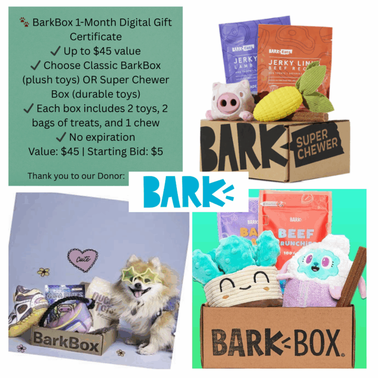 - BarkBox 1-Month Gift Certificate: Toys, treats & holiday joy for your pup (Value: $45 | Starting Bid: $2)